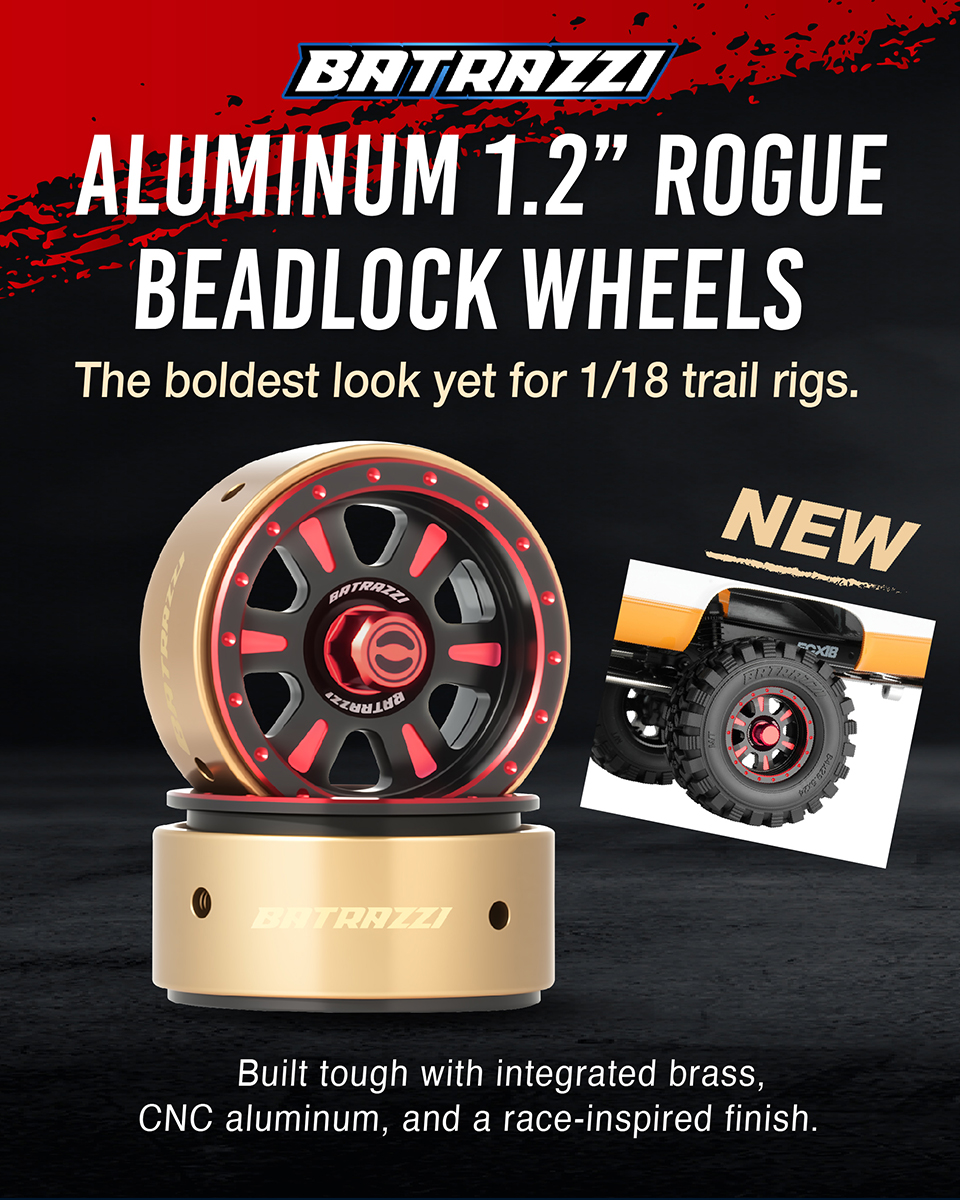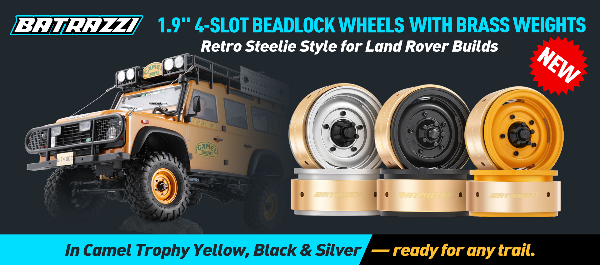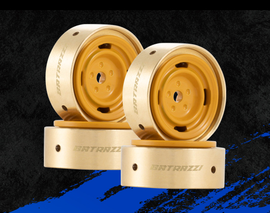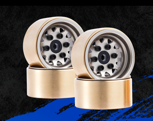 These extra-wide wheels feature a deep-dish design and spinning star for a dynamic, symmetrical look. Brass weights enhance stability and finish. Ideal for 1/24 and 1/18 scale crawlers.
