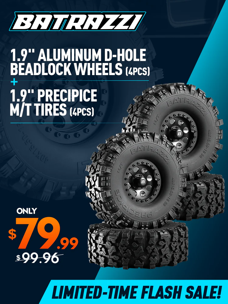 Enhance the performance and aesthetics of your 1/10 or 1/18 scale crawler with the Batrazzi 1.9" Aluminum D-Hole Beadlock Wheels & Tires Set. This premium set combines robust aluminum wheels with high-performance tires, designed to give your crawler superior traction and durability on any terrain.