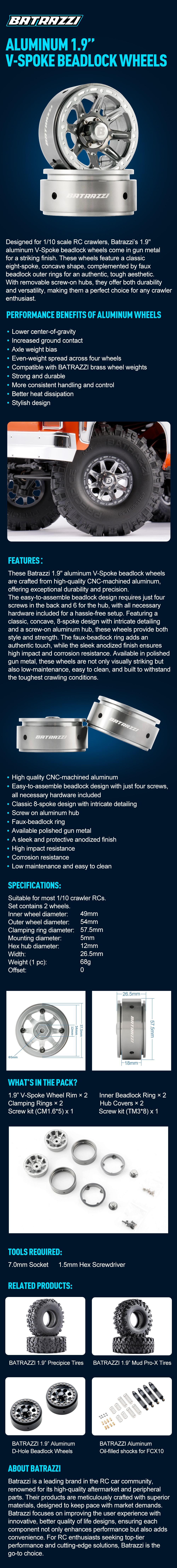 These Batrazzi 1.9" aluminum V-Spoke beadlock wheels are crafted from high-quality CNC-machined aluminum, offering exceptional durability and precision. The easy-to-assemble beadlock design requires just four screws in the back and 6 for the hub, with all necessary hardware included for a hassle-free setup. Featuring a classic, concave, 8-spoke design with intricate detailing and a screw-on aluminum hub, these wheels provide both style and strength. The faux-beadlock ring adds an authentic touch, while the sleek anodized finish ensures high impact and corrosion resistance. Available in polished gun metal, these wheels are not only visually striking but also low-maintenance, easy to clean, and built to withstand the toughest crawling conditions.