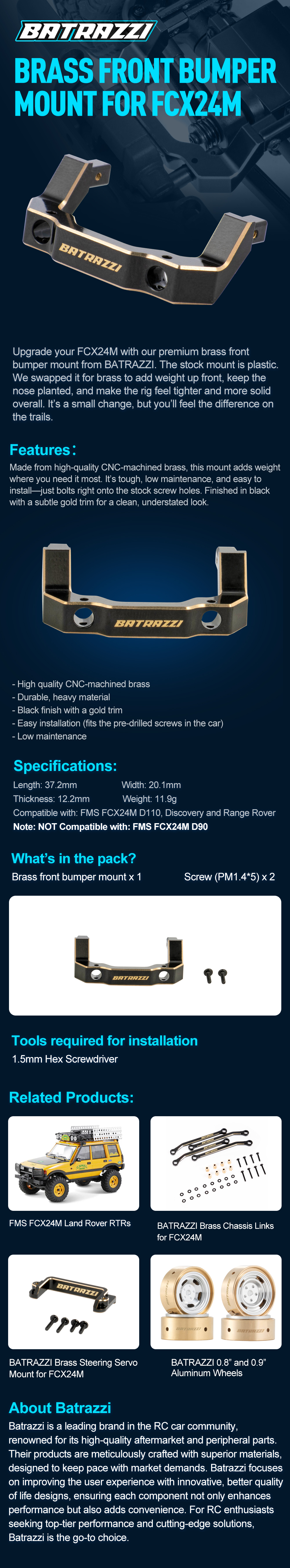Upgrade your FCX24M with our premium brass front bumper mount from BATRAZZI. The stock mount is plastic. We swapped it for brass to add weight up front, keep the nose planted, and make the rig feel tighter and more solid overall. It’s a small change, but you’ll feel the difference on the trails.