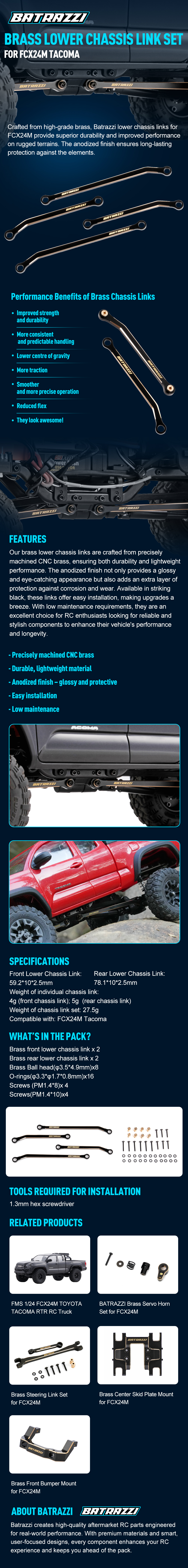 Crafted from high-grade brass, Batrazzi lower chassis links for FCX24M provide superior durability and improved performance on rugged terrains. The anodized finish ensures long-lasting protection against the elements.
