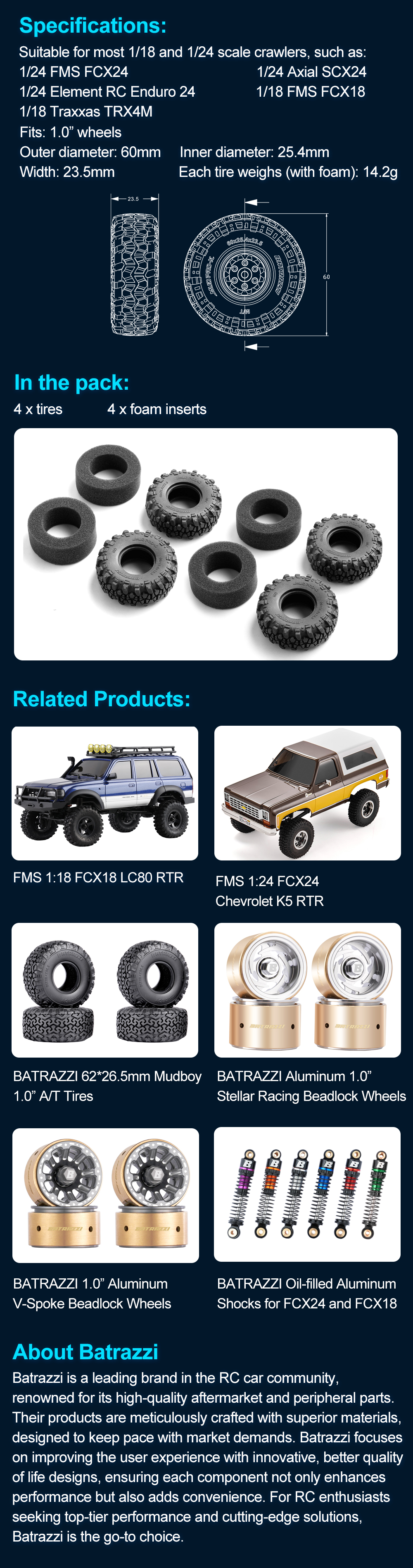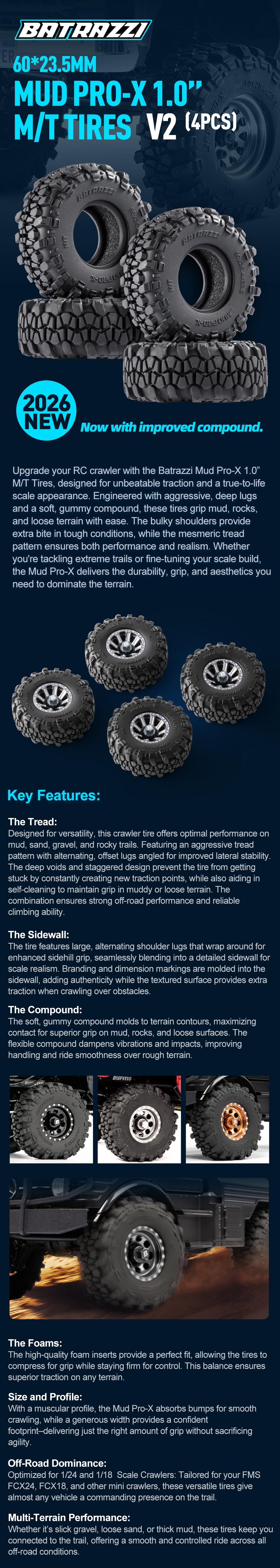 BATRAZZI 60*23.5mm Mud Pro-X 1.0” M/T Tires V2 (4pcs)