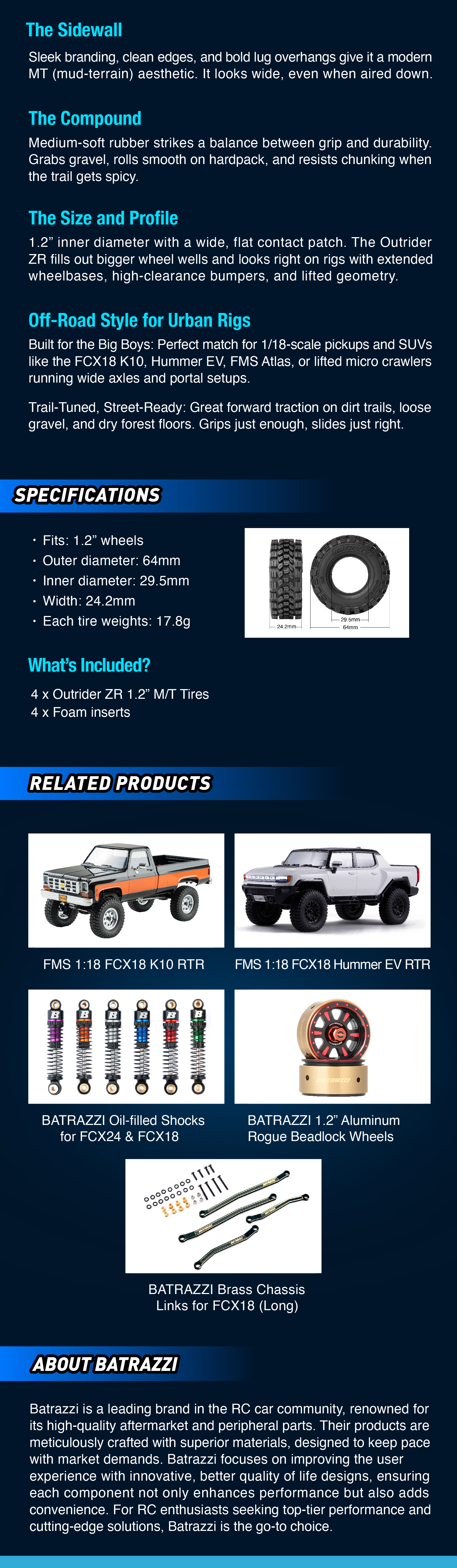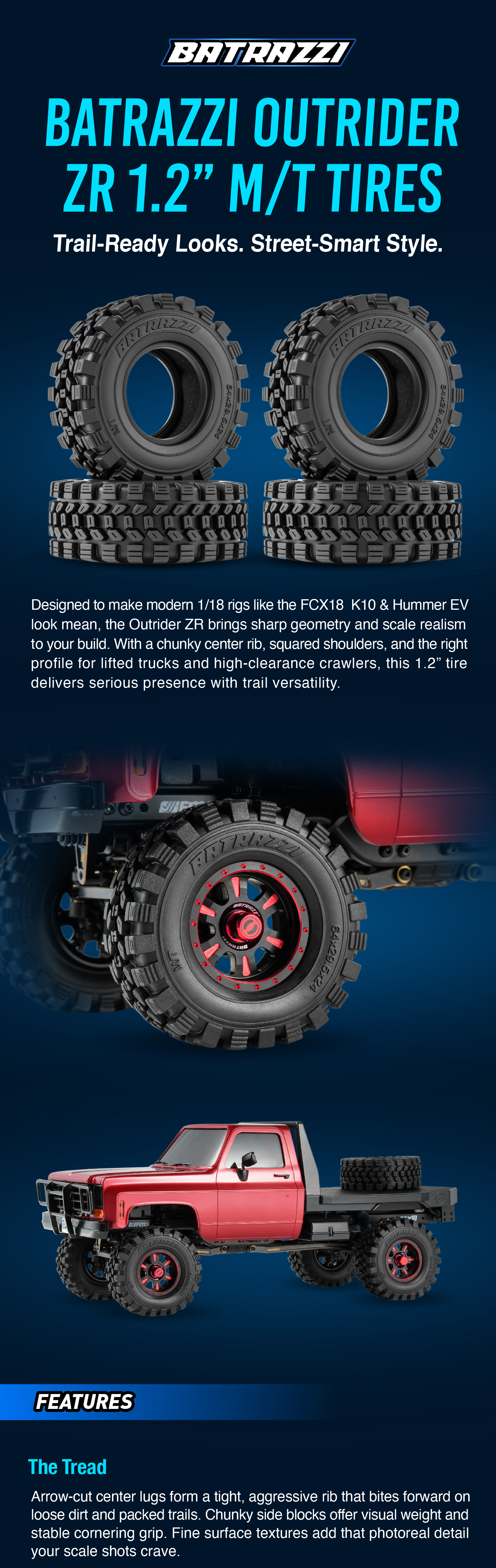 Designed to make modern 1/18 rigs like the FCX18 K10&Hummer EV look mean, the Outrider ZR brings sharp geometry and scale realism to your build. With a chunky center rib, squared shoulders, and the right profile for lifted trucks and high-clearance crawlers, this 1.2” tire delivers serious presence with trail versatility.